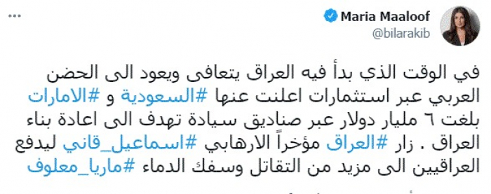 وكتبت في تغريدة عبر "تويتر" رصدها "المشهد العربي": "في الوقت الذي بدأ فيه العراق يتعافى ويعود إلى الحضن العربي عبر استثمارات أعلنت عنها السعودية والإمارات بلغت ٦ مليار دولار عبر صناديق سيادة تهدف إلى إعادة بناء العراق".