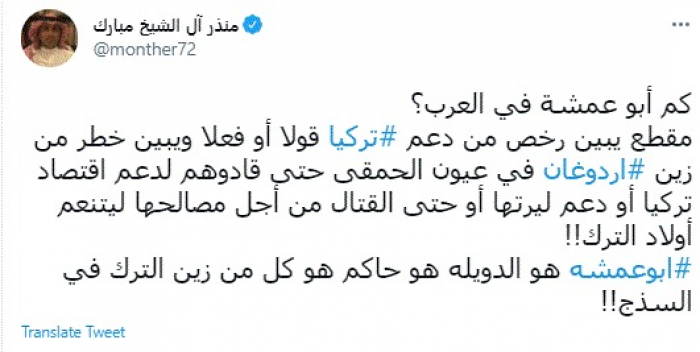 وقال في تغريدة عبر "تويتر" رصدها "المشهد العربي": "كم أبو عمشة في العرب؟ مقطع يبين رخص من دعم تركيا قولا أو فعلا ويبين خطر من زين أردوغان في عيون الحمقى حتى قادوهم لدعم اقتصاد تركيا أو دعم ليرتها أو حتى القتال من أجل مصالحها ليتنعم أولاد الترك.. أبوعمشه هو الدويله هو حاكم هو كل من زين الترك في السذج".