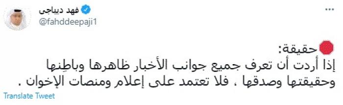 وقال في تغريدة عبر "تويتر" رصدها "المشهد العربي": "إذا أردت أن تعرف جميع جوانب الأخبار ظاهرها وباطِنها وحقيقتها وصدقها، فلا تعتمد على إعلام ومنصات الإخوان".