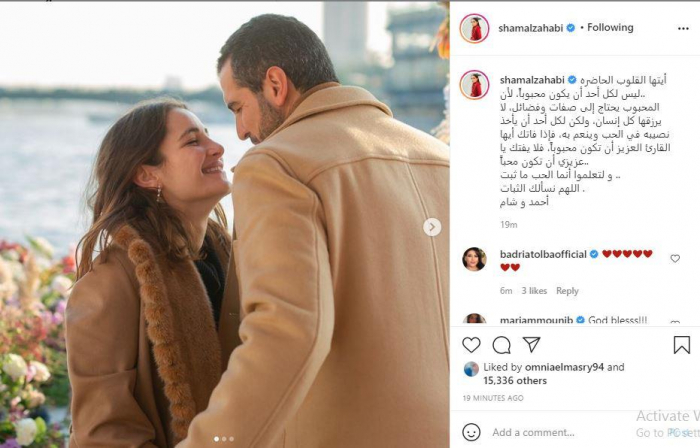 شام لم تتحدث في تعليقها عن حقيقة أن خطبتها ستتم اليوم، كما تردد على مواقع التواصل الاجتماعي وكما صرح الفنان جو رعد عبر "تويتر"، واكتفت بكتابة: "أيتها القلوب الحاضرة.. ليس لكل أحد أن يكون محبوباً، لأن المحبوب يحتاج إلى صفات وفضائل، لا يرزقها كل إنسان، ولكن لكل أحد أن يأخذ نصيبه في الحب وينعم به".