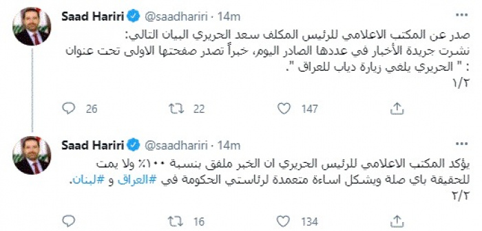 وقال في تغريدات عبر "تويتر" رصدها "المشهد العربي": "صدر عن المكتب الاعلامي للرئيس المكلف سعد الحريري البيان التالي: نشرت جريدة الأخبار في عددها الصادر اليوم، خبراً تصدر صفحتها الاولى تحت عنوان: الحريري يلغي زيارة دياب للعراق".