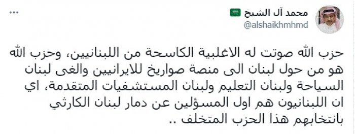 وكتب في تغريدة عبر "تويتر" رصدها "المشهد العربي": "حزب الله صوتت له الأغلبية الكاسحة من اللبنانيين، وحزب الله هو من حول لبنان إلى منصة صواريخ للإيرانيين وألغى لبنان السياحة ولبنان التعليم ولبنان المستشفيات المتقدمة، أي أن اللبنانيون هم اول المسؤلين عن دمار لبنان الكارثي بانتخابهم هذا الحزب المتخلف".