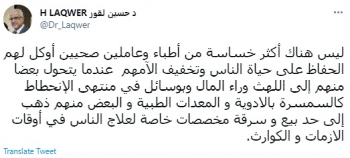 وقال في تغريدة عبر "تويتر" رصدها "المشهد العربي": "ليس هناك أكثر خساسة من أطباء وعاملين صحيين أوكل لهم الحفاظ على حياة الناس وتخفيف الآمهم عندما يتحول بعضا منهم إلى اللهث وراء المال وبوسائل في منتهى الانحطاط كالسمسرة بالأدوية والمعدات الطبية والبعض منهم ذهب إلى حد بيع و سرقة مخصصات خاصة لعلاج الناس في أوقات الأزمات والكوارث".