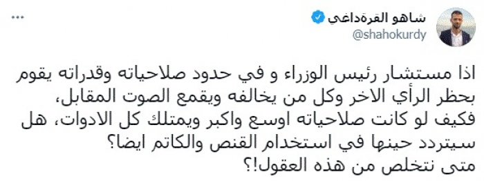 وقال في تغريدة عبر "تويتر" رصدها "المشهد العربي": "إذا مستشار رئيس الوزراء و في حدود صلاحياته وقدراته يقوم بحظر الرأي الآخر وكل من يخالفه ويقمع الصوت المقابل، فكيف لو كانت صلاحياته أوسع واكبر ويمتلك كل الأدوات، هل سيتردد حينها في استخدام القنص والكاتم أيضا؟.. متى نتخلص من هذه العقول".