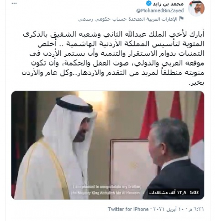 وكتب "بن زايد" عبر تغريدة بحسابه الرسمي بمنصة تويتر، رصدها "المشهد العربي": "أبارك لأخي الملك عبدالله الثاني وشعبه الشقيق بالذكرى المئوية لتأسيس المملكة الأردنية الهاشمية .. أخلص التمنيات بدوام الاستقرار والتنمية وأن يستمر الأردن في موقعه العربي والدولي، صوت العقل والحكمة، وأن تكون مئويته منطلقاً لمزيد من التقدم والازدهار..وكل عام والأردن بخير".