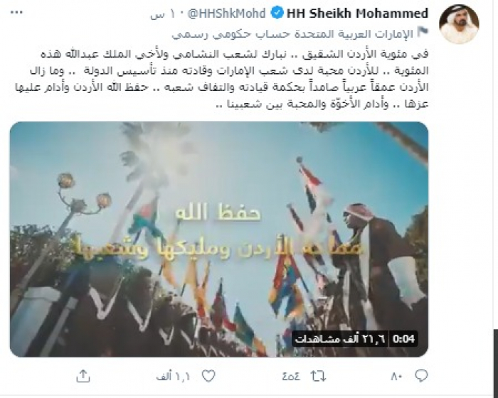 وكتب "محمد بن راشد" رسالة التهنئة عبر حسابه الرسمي على "تويتر" رصدها "المشهد العربي": "في مئوية الأردن الشقيق.. نبارك لشعب النشامي ولأخي الملك عبدالله هذه المئوية".