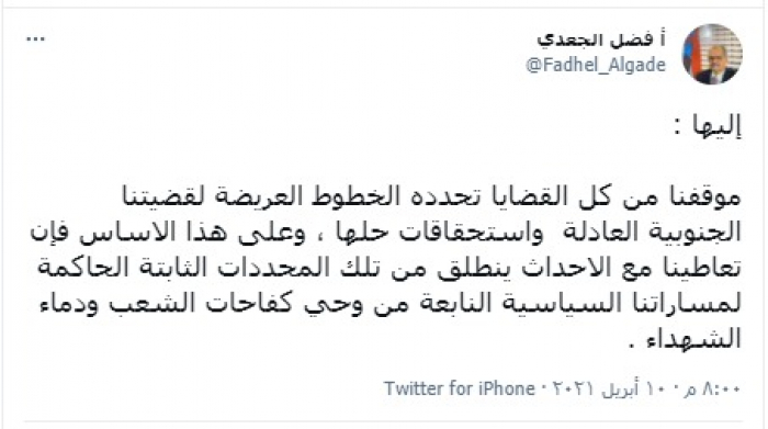 وكتب "الجعدي" تغريدة عبر تويتر، رصدها "المشهد العربي": "موقفنا من كل القضايا تحدده الخطوط العريضة لقضيتنا الجنوبية العادلة واستحقاقات حلها، وعلى هذا الأساس فإن تعاطينا مع الأحداث ينطلق من تلك المحددات الثابتة الحاكمة لمساراتنا السياسية النابعة من وحي كفاحات الشعب ودماء الشهداء".