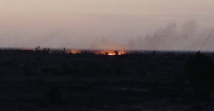 ودمرت ألسنة اللهب المخيم ، المبني من سعف النخيل، كليًا، بعد استمرارها لعدة ساعات.