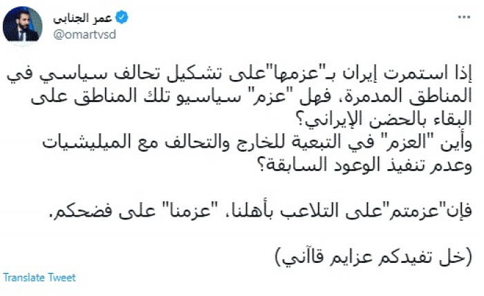 وقال في تغريدة عبر "تويتر" رصدها "المشهد العربي": "إذا استمرت إيران بعزمها على تشكيل تحالف سياسي في المناطق المدمرة، فهل عزم سياسيو تلك المناطق على البقاء بالحضن الإيراني؟".