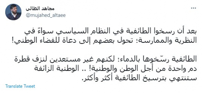 وكتب في تغريدة عبر "تويتر" رصدها "المشهد العربي": "بعد أن رسخوا الطائفية في النظام السياسي سواءً في النظرية والممارسة؛ تحول بعضهم إلى دعاة للفضاء الوطني! الطائفية رسّخوها بالدماء؛ لكنهم غير مستعدين لنزف قطرة دم واحدة من أجل الوطن والوطنية! .. الوطنية الزائفة ستنتهي بترسيخ الطائفية أكثر وأكثر".