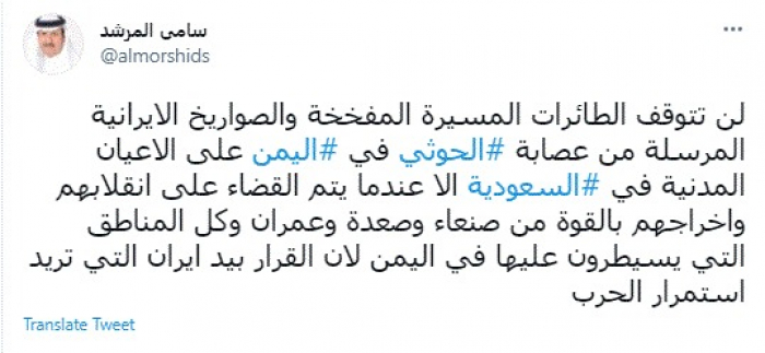 وقال في تغريدة عبر "تويتر" رصدها "المشهد العربي": "لن تتوقف الطائرات المُسيرة المفخخة والصواريخ الإيرانية المرسلة من عصابة الحوثي في اليمن على الأعيان المدنية في السعودية إلا عندما يتم القضاء على انقلابهم وإخراجهم بالقوة من صنعاء وصعدة وعمران وكل المناطق التي يسيطرون عليها في اليمن لأن القرار بيد إيران التي تريد استمرار الحرب".