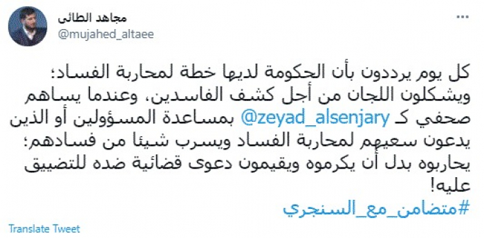 وقال في تغريدة عبر "تويتر" رصدها "المشهد العربي": "كل يوم يرددون بأن الحكومة لديها خطة لمحاربة الفساد؛ ويشكلون اللجان من أجل كشف الفاسدين، وعندما يساهم صحفي كزياد السنجري بمساعدة المسؤولين أو الذين يدعون سعيهم لمحاربة الفساد ويسرب شيئا من فسادهم؛ يحاربوه بدل أن يكرموه ويقيمون دعوى قضائية ضده للتضييق عليه".