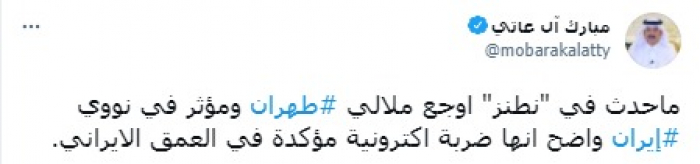 وقال في تغريدة على حسابه بموقع التدوين المصغر تويتر، اليوم إن: "ما حدث في (نطنز) أوجع ملالي طهران ومؤثر في نووي إيران".