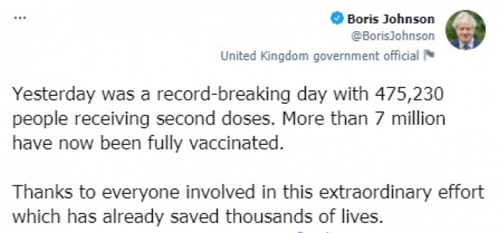 وقال في تغريدة على حسابه بموقع التدوين المصغر تويتر، اليوم إنه: "كان يوم أمس يوم تحطيم الأرقام القياسية حيث تلقى 475230 شخصًا جرعات ثانية".