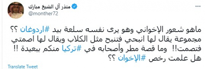 وقال في تغريدة عبر "تويتر" رصدها "المشهد العربي": "ما هو شعور الإخواني وهو يرى نفسه سلعة بيد أردوغان؟.. مجموعة يقال لها انبحي فتنبح مثل ... ويقال لها اصمتي فتصمت!! وما قصة مطر وأصحابه في تركيا منكم ببعيدة.. هل علمت رخص الإخوان".