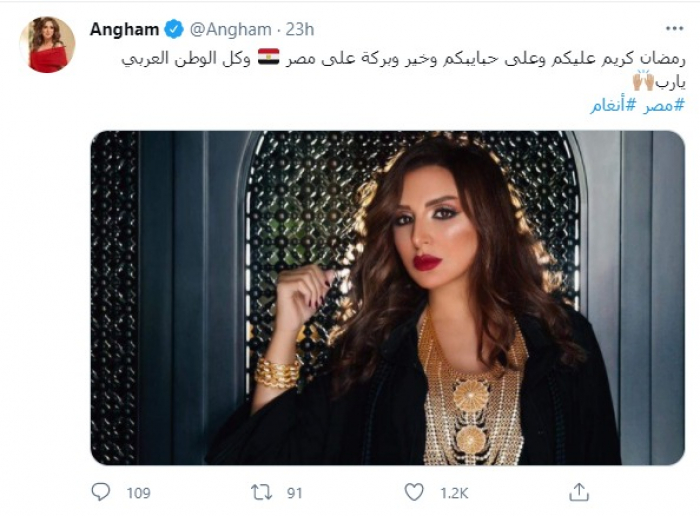 وكتبت أنغام، عبر حسابها على تويتر: "رمضان كريم عليكم وعلى حبايبكم وخير وبركة على مصر، وكل الوطن العربي يا رب".