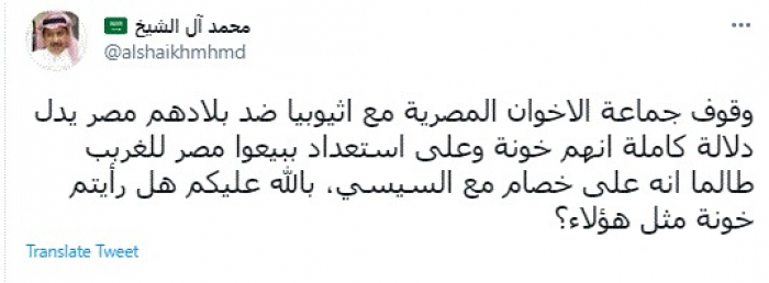 وقال في تغريدة عبر "تويتر" رصدها "المشهد العربي": "وقوف جماعة الإخوان المصرية مع إثيوبيا ضد بلادهم مصر يدل دلالة كاملة أنهم خونة وعلى استعداد ببيعوا مصر للغربب طالما أنه على خصام مع السيسي، بالله عليكم هل رأيتم خونة مثل هؤلاء؟".
