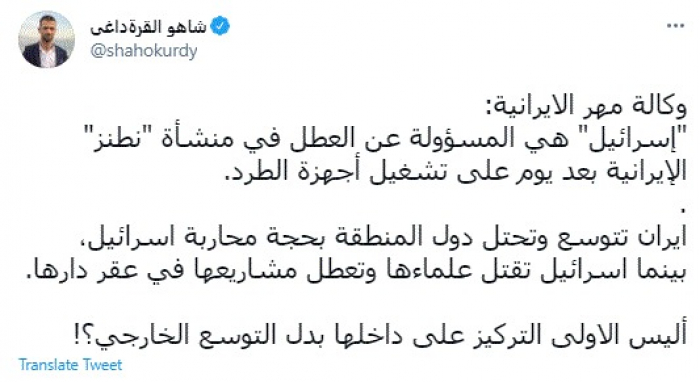دعا الكاتب الصحفي العراقي شاهو القرةداغي، اليوم، إيران للتركيز على المشاكل الداخلية وعدم التفكير في التوسع الخارجي، عقب استهداف إسرائيل لمنشأة نطنز النووية.