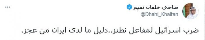 وكتب في تغريدة عبر "تويتر" رصدها "المشهد العربي": "ضرب إسرائيل لمفاعل نطنز.. دليل ما لدى إيران من عجز".