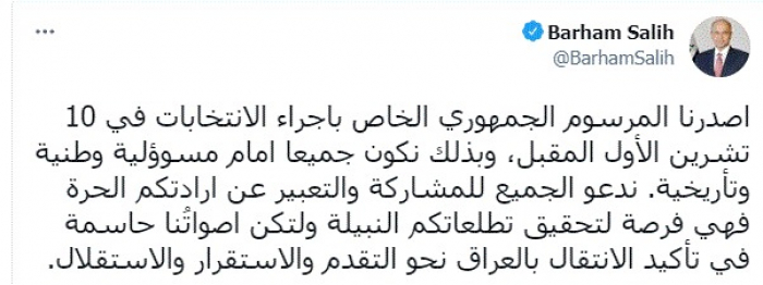 أصدر رئيس الجمهورية العراقية برهم صالح، اليوم، مرسومًا جمهوريًا بشأن إجراء الانتخابات، داعيًا الجميع للمشاركة والتعبير عن إرادة الشعب الحرة.