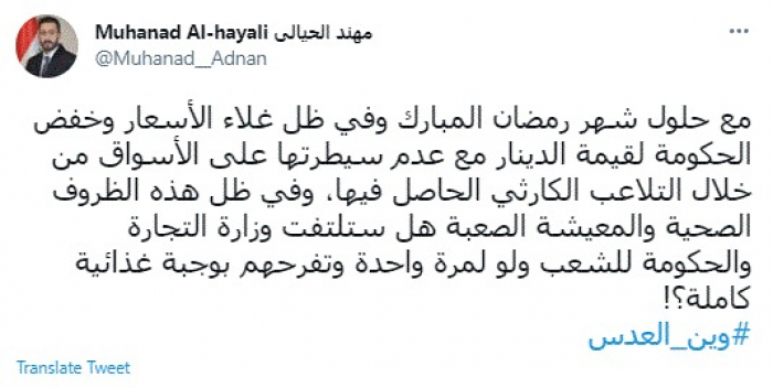 وقال في تغريدة عبر "تويتر" رصدها "المشهد العربي": "مع حلول شهر رمضان المبارك وفي ظل غلاء الأسعار وخفض الحكومة لقيمة الدينار مع عدم سيطرتها على الأسواق من خلال التلاعب الكارثي الحاصل فيها، وفي ظل هذه الظروف الصحية والمعيشة الصعبة هل ستلتفت وزارة التجارة والحكومة للشعب ولو لمرة واحدة وتفرحهم بوجبة غذائية كاملة؟".