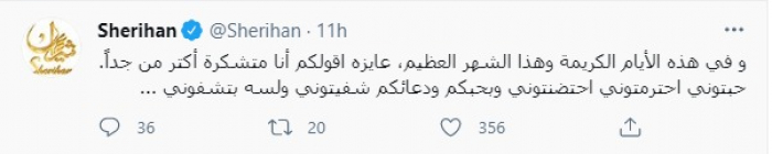 وكتبت شريهان تغريدة، عبر حسابها الرسمي بموقع "تويتر": "وفي هذه الأيام الكريمة وهذا الشهر العظيم، عايزة أقولكم أنا متشكرة أكتر من جداً، حبتوني احترمتوني احتضنتوني وبحبكم، وبدعائكم شفيتوني ولسه بتشفوني".