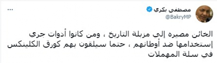 وأشار في تغريدة على حسابه بموقع التدوين المصغر تويتر، اليوم إلى أن: "الخائن مصيره إلي مزبلة التاريخ".