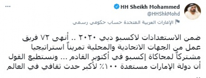 وأشار في تغريدة على حسابه بموقع التدوين المصغر تويتر، اليوم إلى أنه: "ضمن الاستعدادات لإكسبو دبي 2020، أنهى 72 فريق عمل من الجهات الاتحادية والمحلية تمرينا استراتيجيا مشتركا لمحاكاة إكسبو في أكتوبر القادم".