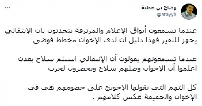 وأكد في تغريدة على حسابه بموقع التدوين المصغر تويتر، اليوم أنه: "عندما تسمعون أبواق الإعلام والمرتزقة يتحدثون بأن الانتقالي يجهز للنفير فهذا دليل أن لدى الإخوان مخطط فوضى".