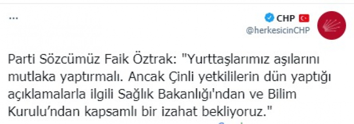 طالب نائب رئيس حزب الشعب الجمهوري التركي المعارض فائق أوزتراك، حكومة الرئيس رجب طيب أردوغان بالرد على تصريحات السلطات الصينية حول ضعف قدرات اللقاح الصيني على الوقاية من فيروس كورونا.