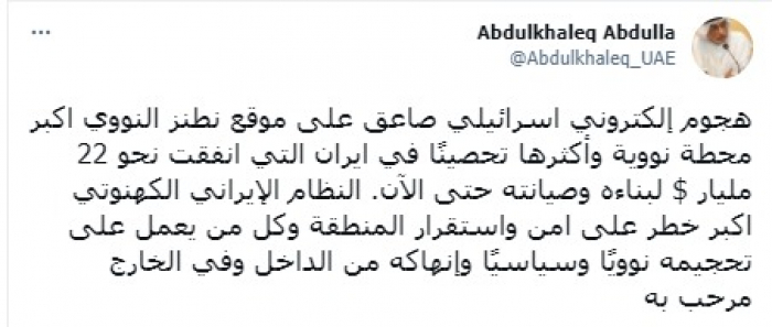 وأشار في تغريدة على حسابه بموقع التدوين المصغر تويتر، اليوم إلى وقوع: "هجوم إلكتروني إسرائيلي صاعق على موقع نطنز النووي أكبر محطة نووية وأكثرها تحصينًا في إيران التي أنفقت نحو 22 مليار دولار لبنائه وصيانته حتى الآن".