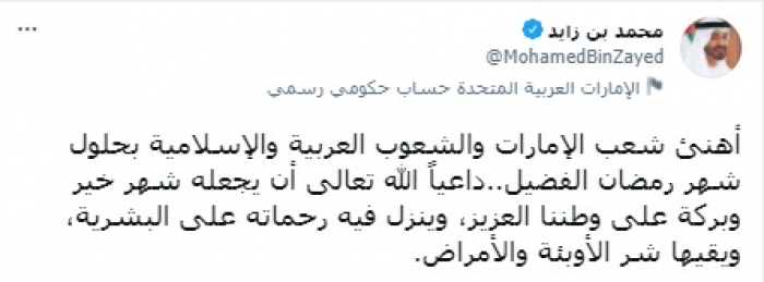وقال في تغريدة على حسابه بموقع التدوين المصغر تويتر، اليوم إني: "أهنئ شعب الإمارات والشعوب العربية والإسلامية بحلول شهر رمضان الفضيل".