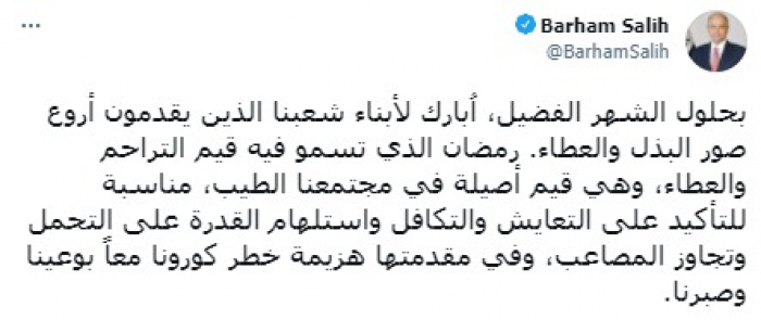 وأشار في تغريدة على حسابه بموقع التدوين المصغر تويتر، اليوم إلى أنه: "بحلول الشهر الفضيل، اُبارك لأبناء شعبنا الذين يقدمون أروع صور البذل والعطاء".