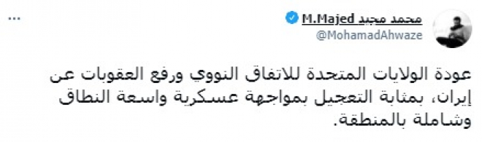 وأوضح في تغريدة على حسابه بموقع التدوين المصغر تويتر، اليوم أن: "عودة الولايات المتحدة للاتفاق النووي ورفع العقوبات عن إيران، بمثابة التعجيل بمواجهة عسكرية واسعة النطاق وشاملة بالمنطقة".