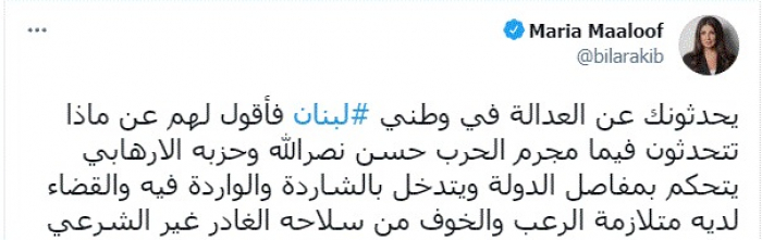 وقالت في تغريدة عبر "تويتر" رصدها "المشهد العربي": "يحدثونك عن العدالة في وطني لبنان فأقول لهم عن ماذا تتحدثون فيما مجرم الحرب حسن نصرالله وحزبه الإرهابي يتحكم بمفاصل الدولة ويتدخل بالشاردة والواردة فيه والقضاء لديه متلازمة الرعب والخوف من سلاحه الغادر غير الشرعي".