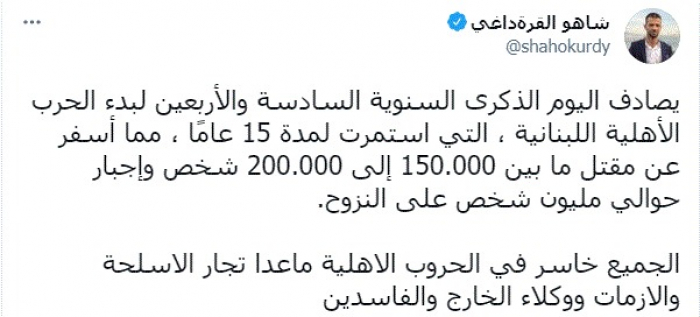 علق الكاتب الصحفي العراقي شاهو القرةداغي، اليوم، على ذكرى الحرب الأهلية اللبنانية، مؤكدًا أن الجميع خاسر في الحروب الأهلية ما عدا تجار الأسلحة والأزمات ووكلاء الخارج والفاسدين.