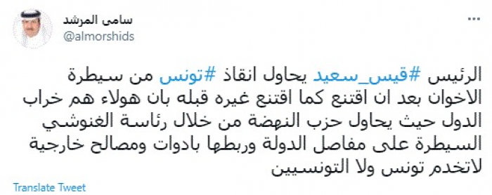 وكتب في تغريدة عبر "تويتر" رصدها "المشهد العربي": "الرئيس قيس سعيد يحاول إنقاذ تونس من سيطرة الإخوان بعد أن اقتنع كما اقتنع غيره قبله بأن هولاء هم خراب الدول حيث يحاول حزب النهضة من خلال رئاسة الغنوشي السيطرة على مفاصل الدولة وربطها بأدوات ومصالح خارجية لا تخدم تونس ولا التونسيين".