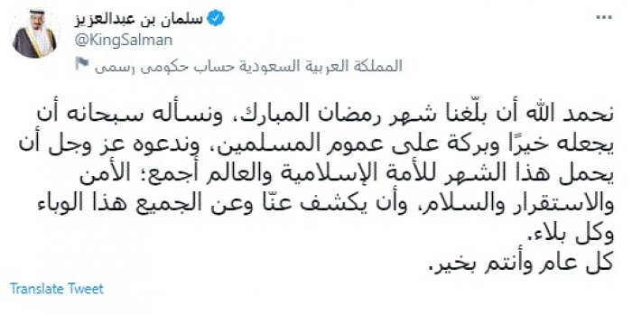 وقال في تغريدة عبر "تويتر" رصدها "المشهد العربي": "نحمد الله أن بلّغنا شهر رمضان المبارك، ونسأله سبحانه أن يجعله خيرًا وبركة على عموم المسلمين، وندعوه عز وجل أن يحمل هذا الشهر للأمة الإسلامية والعالم أجمع؛ الأمن والاستقرار والسلام، وأن يكشف عنّا وعن الجميع هذا الوباء وكل بلاء.. كل عام وأنتم بخير".