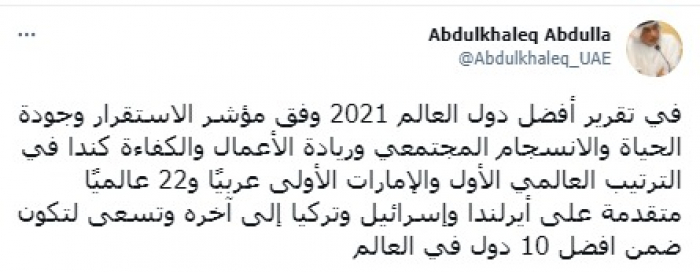 وقال في تغريدة على حسابه بموقع التدوين المصغر تويتر، اليوم إنه: "في تقرير أفضل دول العالم 2021 وفق مؤشر الاستقرار وجودة الحياة والانسجام المجتمعي وريادة الأعمال والكفاءة كندا في الترتيب العالمي الأول".