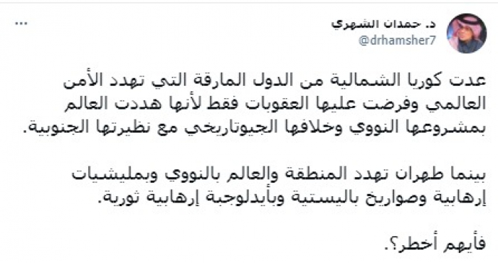الشهري: نظام ملالي طهران أخطر من دولة كوريا الشمالية