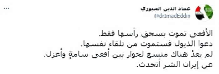 وتابع: "دعوا الذيول فستموت من تلقاء نفسها"، موضحا أنه: "لم يعدْ هناك متسع لحوار بين أفعى سامةٍ وأعزل"، مختتما: