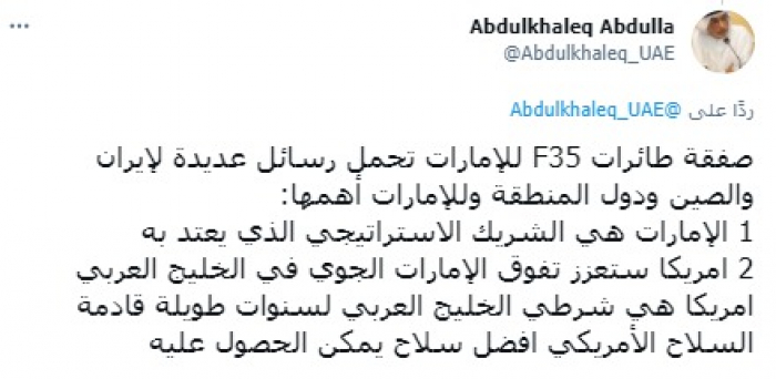وأوضح في تغريدة على حسابه بموقع التدوين المصغر تويتر، اليوم أن: "صفقة طائرات F35 للإمارات تحمل رسائل عديدة لإيران والصين ودول المنطقة وللإمارات".