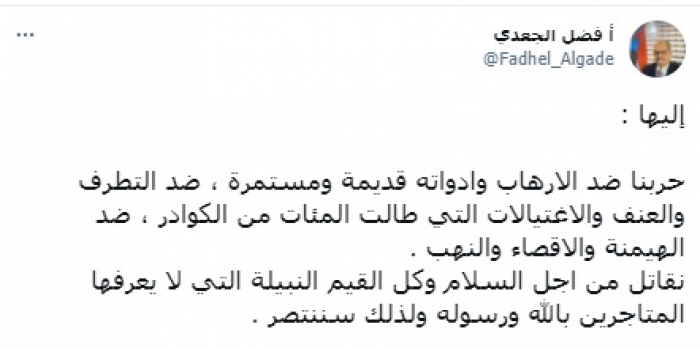 وقال في تغريدة على حسابه بموقع التدوين المصغر تويتر، اليوم إن: "حربنا ضد الإرهاب وأدواته قديمة ومستمرة".