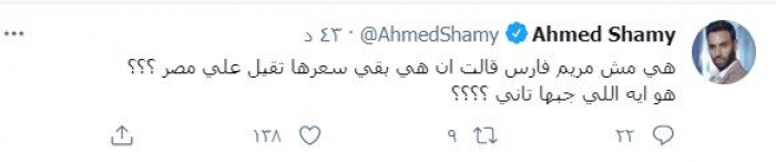 وكتب "الشامي" عبر حسابه الرسمي بموقع تويتر: "هي مش ميريام فارس قالت إن هي بقى سعرها تقيل على مصر، هو إيه اللي جابها تاني".