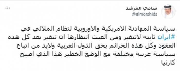 وأوضح في تغريدة على حسابه بموقع التدوين المصغر تويتر، اليوم أن: "سياسة المهادنة الأمريكية والأوروبية لنظام الملالي في إيران ثابتة لا تتغير ومن العبث انتظارها أن تتغير بعد كل هذه العقود، وكل هذه الجرائم بحق الدول العربية".