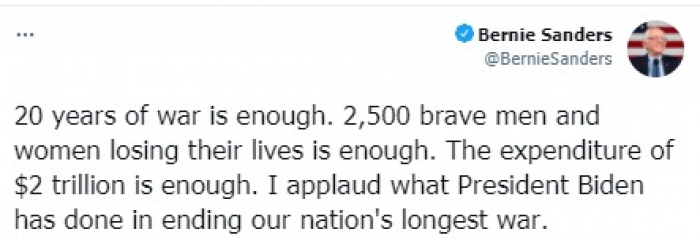 رحب السيناتور الأمريكي بيرني ساندرز أن قرار الرئيس جو بايدن بسحب القوات الأمريكية من أفغانستان، مؤكدا أن بلاده انفقت تريليوني دولار خلال عقدين من الحروب.