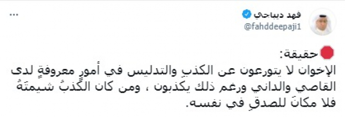 وأوضح في تغريدة على حسابه بموقع التدوين المصغر تويتر، اليوم أن: "الإخوان لا يتورعون عن الكذبِ والتدليس في أمورٍ معروفةٍ لدى القاصي والداني، ورغم ذلك يكذبون".