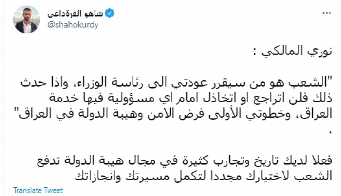 وقال في تغريدة عبر "تويتر" رصدها "المشهد العربي": "نوري المالكي: الشعب هو من سيقرر عودتي الى رئاسة الوزراء، واذا حدث ذلك فلن اتراجع او اتخاذل امام اي مسؤولية فيها خدمة العراق، وخطوتي الأولى فرض الامن وهيبة الدولة في العراق.. فعلا لديك تاريخ وتجارب كثيرة في مجال هيبة الدولة تدفع الشعب لاختيارك مجددا لتكمل مسيرتك وانجازاتك".