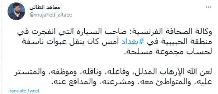 وقال في تغريدة عبر "تويتر" رصدها "المشهد العربي": "وكالة الصحافة الفرنسية: صاحب السيارة التي انفجرت في منطقة الحبيبية في بغداد أمس كان ينقل عبوات ناسفة لحساب مجموعة مسلحة. لعن الله الإرهاب المدلل، وفاعله، وناقله، وموظفه، والمتستر عليه، والمتواطئ معه، ومشرعنه، والمدافع عنه".