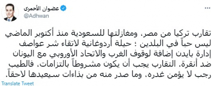 وقال في تغريدة عبر "تويتر" رصدها "المشهد العربي": "تقارب تركيا من مصر، ومغازلتها للسعودية منذ أكتوبر الماضي ليس حباً في البلدين ؛ حيلة أردوغانية لاتقاء شر عواصف إدارة بايدن إضافة لوقوف الغرب والاتحاد الأوروبي مع اليونان ضد أنقرة. التقارب يجب أن يكون مشروطاً بالتزامات".